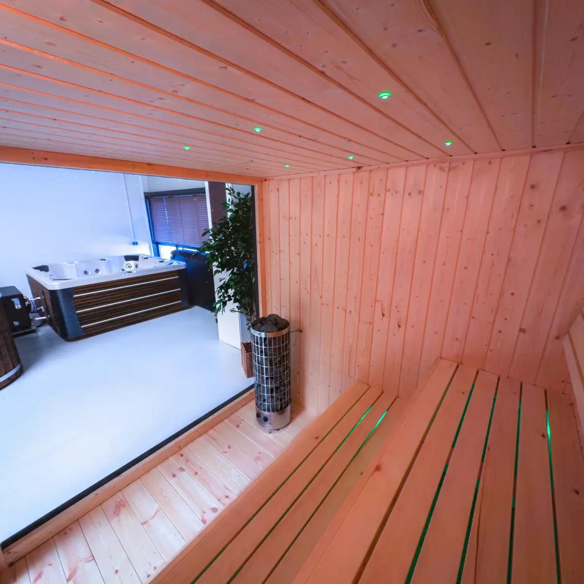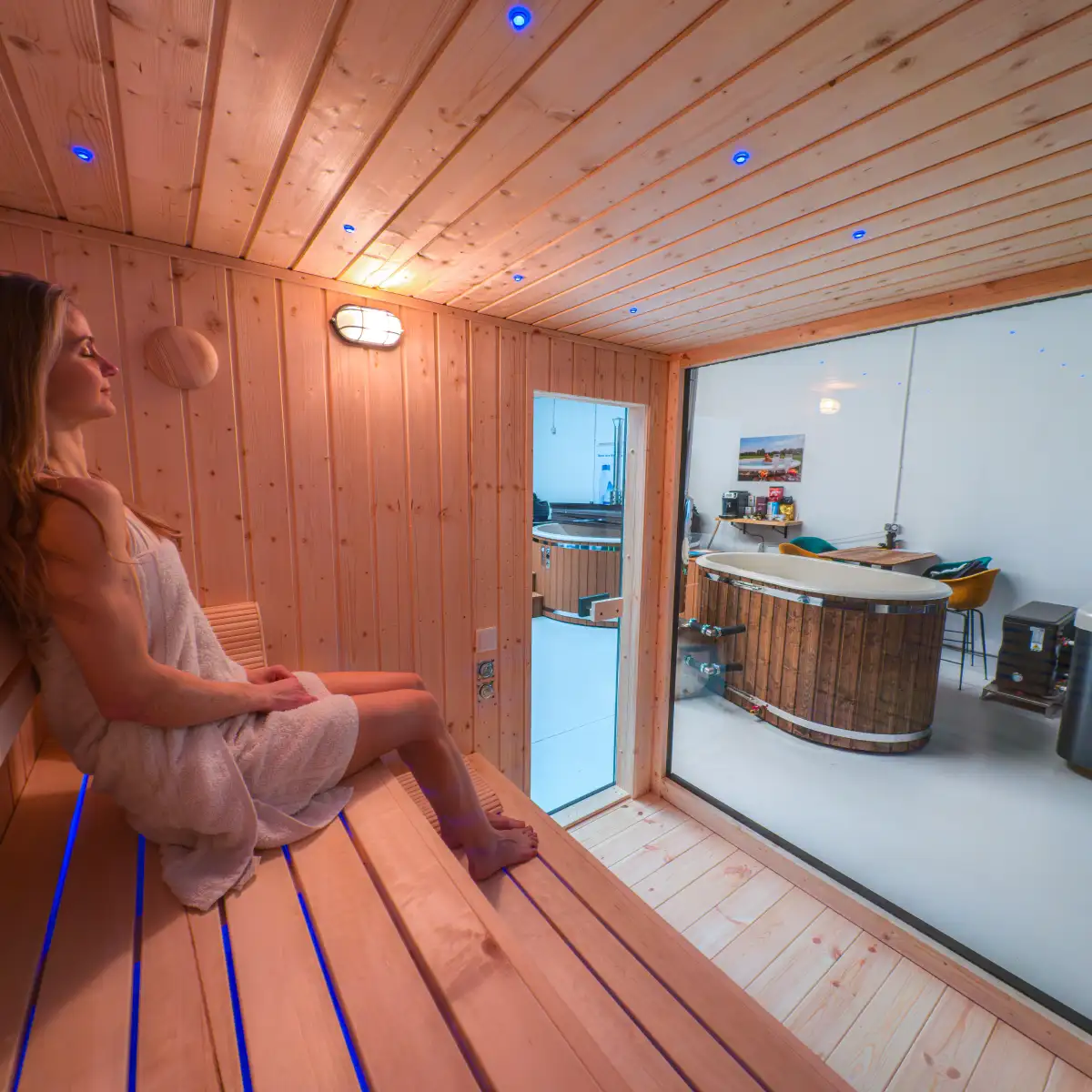 Een LED-strip rondom de saunadeur voegt een stijlvol detail toe en zorgt voor een unieke, sfeervolle uitstraling.