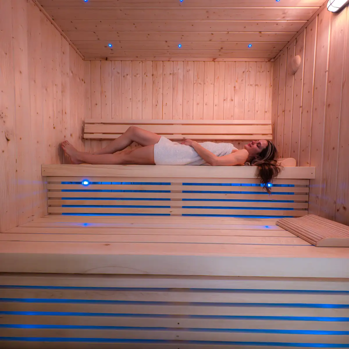 De LED-verlichting geeft de saunabankjes een luxe accent, zorgt voor een moderne uitstraling en een gezellige sfeer.